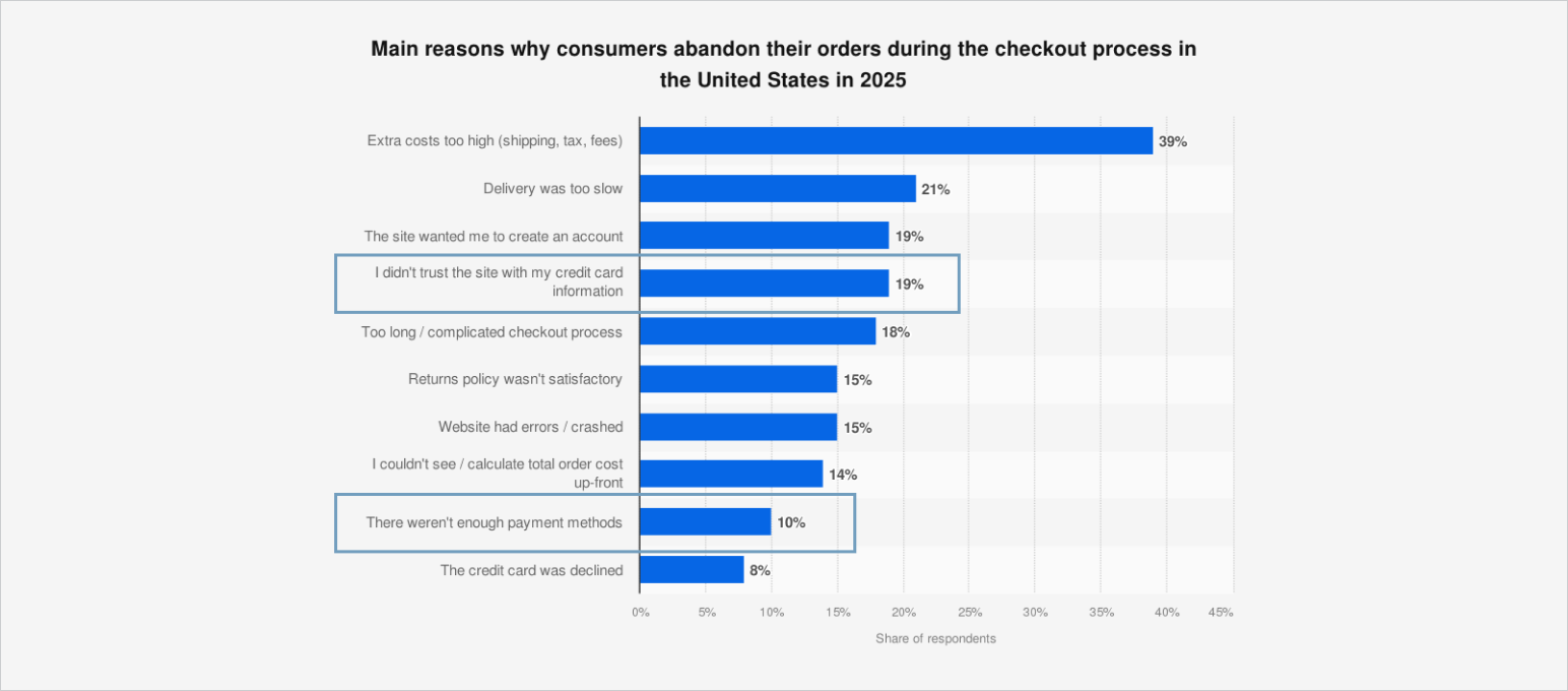 Fraud and trust issues lead to lost revenue and damage the reputation of your brand. According to a 2025 Baymard Institute’s survey, 19% of U.S. consumers abandoned their online orders because they didn’t trust the site. Another 10% left because there weren’t enough payment methods.
