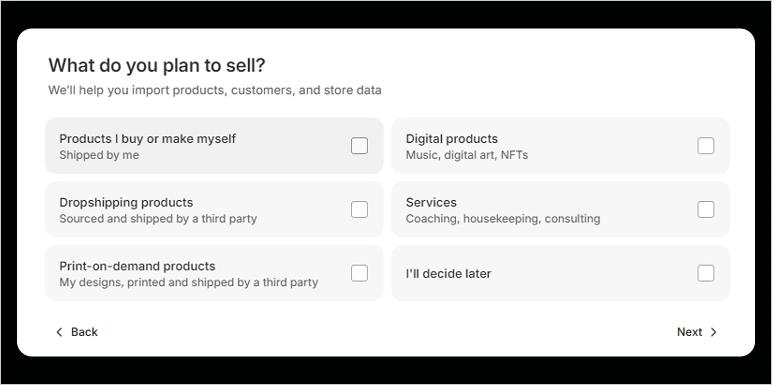 You’ll then be asked a few questions about your business, which helps Shopify personalize your experience. However, these questions are optional, and you can skip them to proceed directly to your store setup.